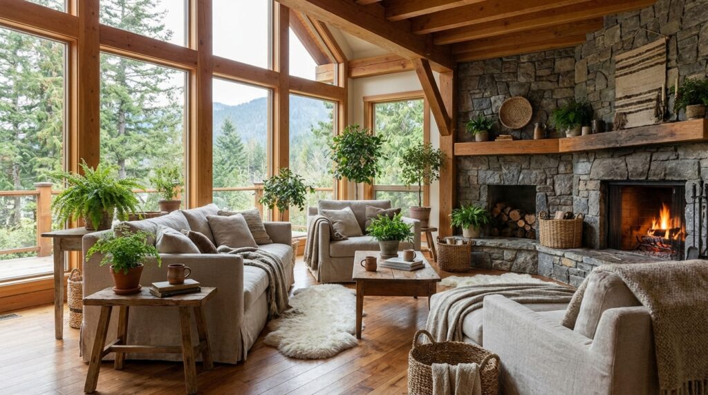 You want materials that feel honest, not polished to perfection. Natural living room decor leans toward wood, linen, wool, sometimes stone.